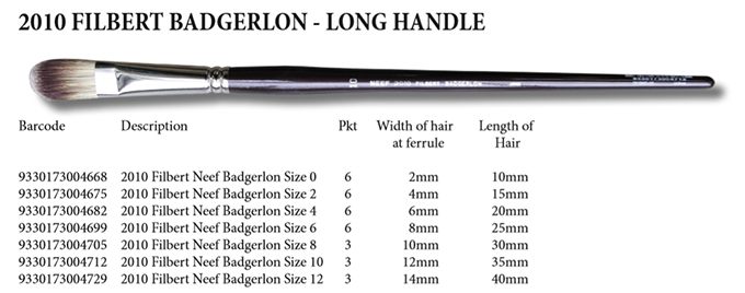 The new NEEF 2010 synthetic Badgerlon brush range has been developed to simulate natural badger hair, it has the ability to hold plenty of colour and the hair holds its shape extremely well just like the interlocked hog series 1150. Each synthetic filament shape is random like natural badger hair and is treated and double heated so it behaves like the natural version. Ideal for heavy bodied acrylic and oil painting on canvas. An excellent durable new addition to the superior Neef brush range.