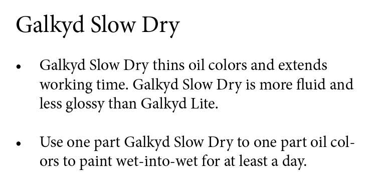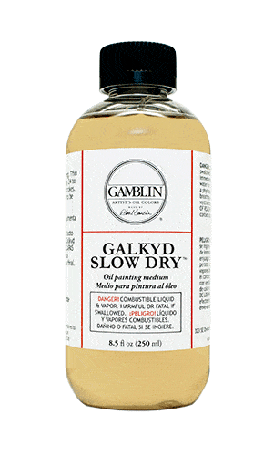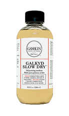 Galkyd Slow Dry thins oil colors and extends working time. Galkyd Slow Dry is more fluid and less glossy than Galkyd Lite.