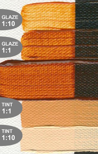 Each Heavy Body colour formula reflects the qualities of its pigment. Colours that tolerate a higher pigment load dry to a more opaque, matte finish. Colours that are more reactive and do not allow as much pigment loading tend to have a glossier, more transparent, finish. Because Heavy Body colours contain no matting agents, the gloss of each colour will be different.