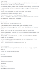 - Mix as much as you like into acrylic colour to create the viscosity and transparency you want - the more you add, the thinner and more transparent your colour will become