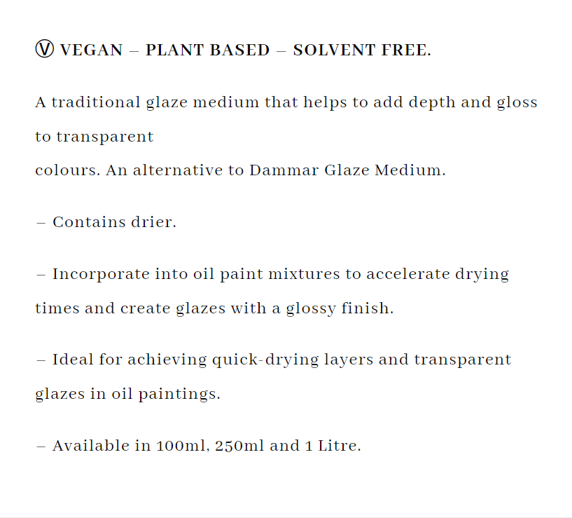 – Ideal for achieving quick-drying layers and transparent glazes in oil paintings.