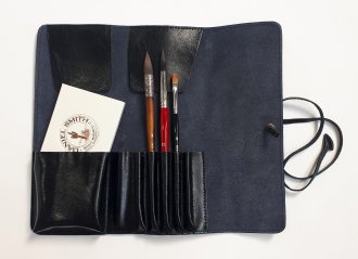 Soft 100% leather brush wrap perfect for watercolour brushes and a small palette box such as the Daniel Smith sets or Fome metal palettes. Available in 4 colours: Charcoal, Black, Green or Brown leather. (Wrap excludes brushes and palette).