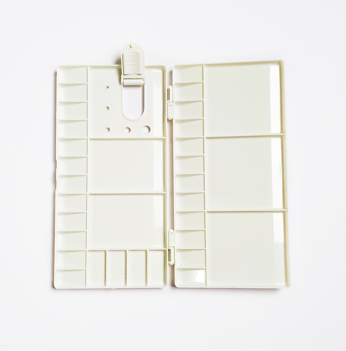 Plastic handheld palette for watercolour with 20 paint wells and 5 mixing wells. 25x13cm when closed.