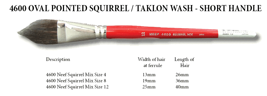 A new development has been the combination of squirrel and taklon. TAKLON For point and spring, SQUIRREL for colour carrying capacity. This mix gives a superb brush for watercolour in particular at a much lower price than sable. Traditionally watercolourists have used brushes made from squirrel, however the hair is expensive. 20% of the SQUIRREL / TAKLON brush hair is made from blue Squirrel. This hair is a lot lighter than the taklon so the actual hair volume for the squirrel component seems much greater. Squirrel retains lots of water and when combined with taklon it makes a perfectly affordable watercolour brush.