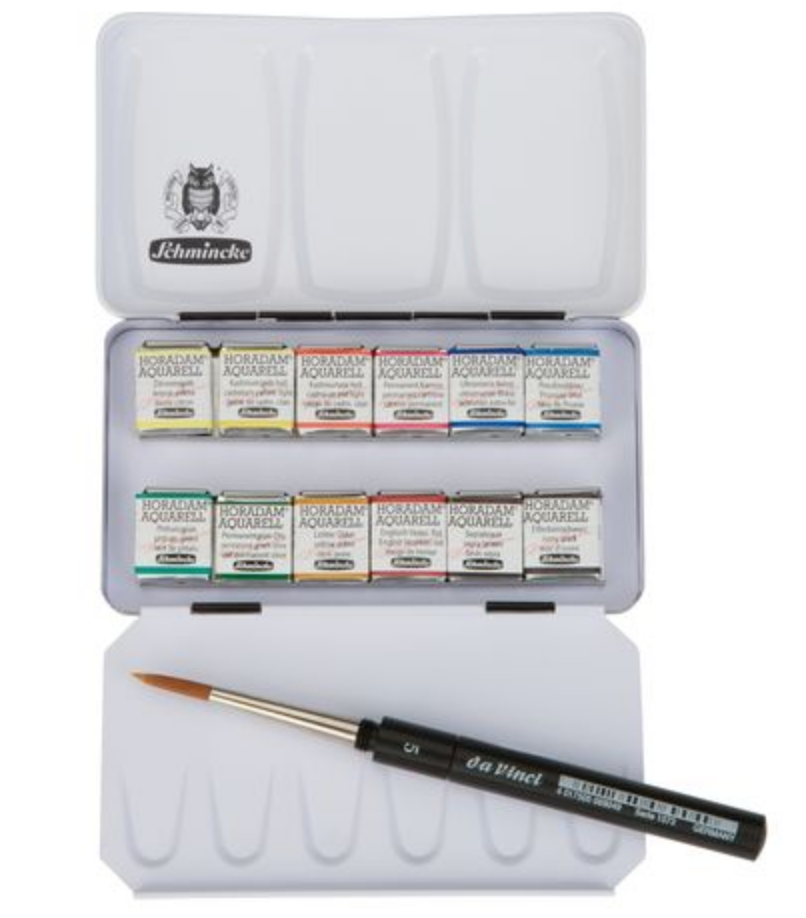 Schmincke Horadam Metal set with 12 x ½ pans and 1 brush Ideal for travelling.